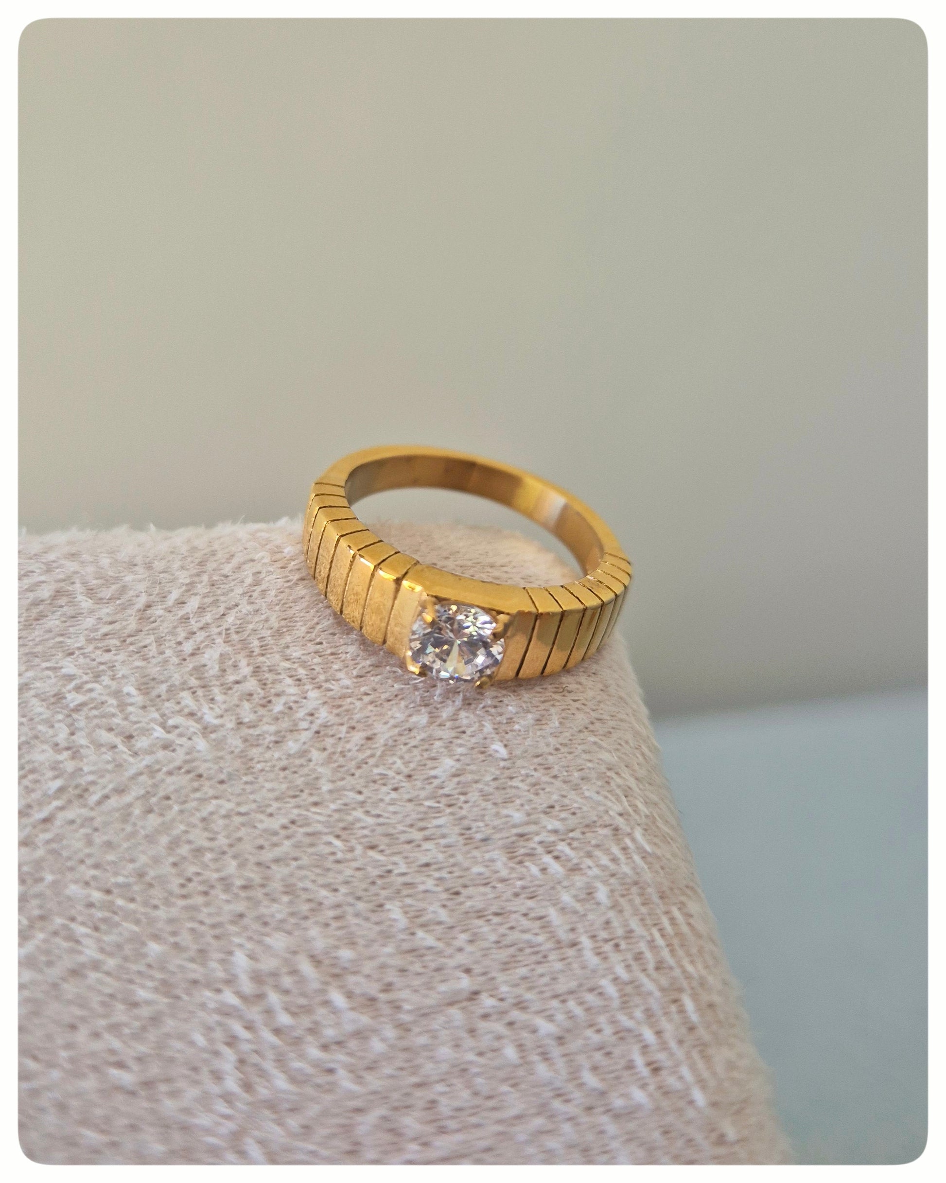 “Lumen” tiene un diseño dorado con textura que abraza una circonita central, creando un contraste sutil entre fuerza y delicadeza. Su acabado brilla con cada movimiento y aporta ese toque especial que transforma cualquier gesto.