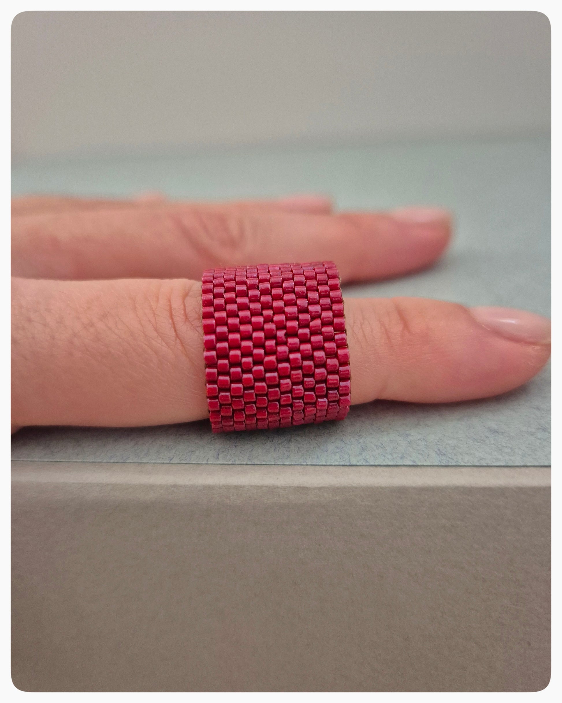 “Borgoña” es un anillo tejido con cuentas Miyuki que envuelve tu dedo con un tono profundo, cálido y lleno de actitud. Su textura geométrica crea un efecto visual que atrapa la luz y hace que tus manos hablen sin esfuerzo.