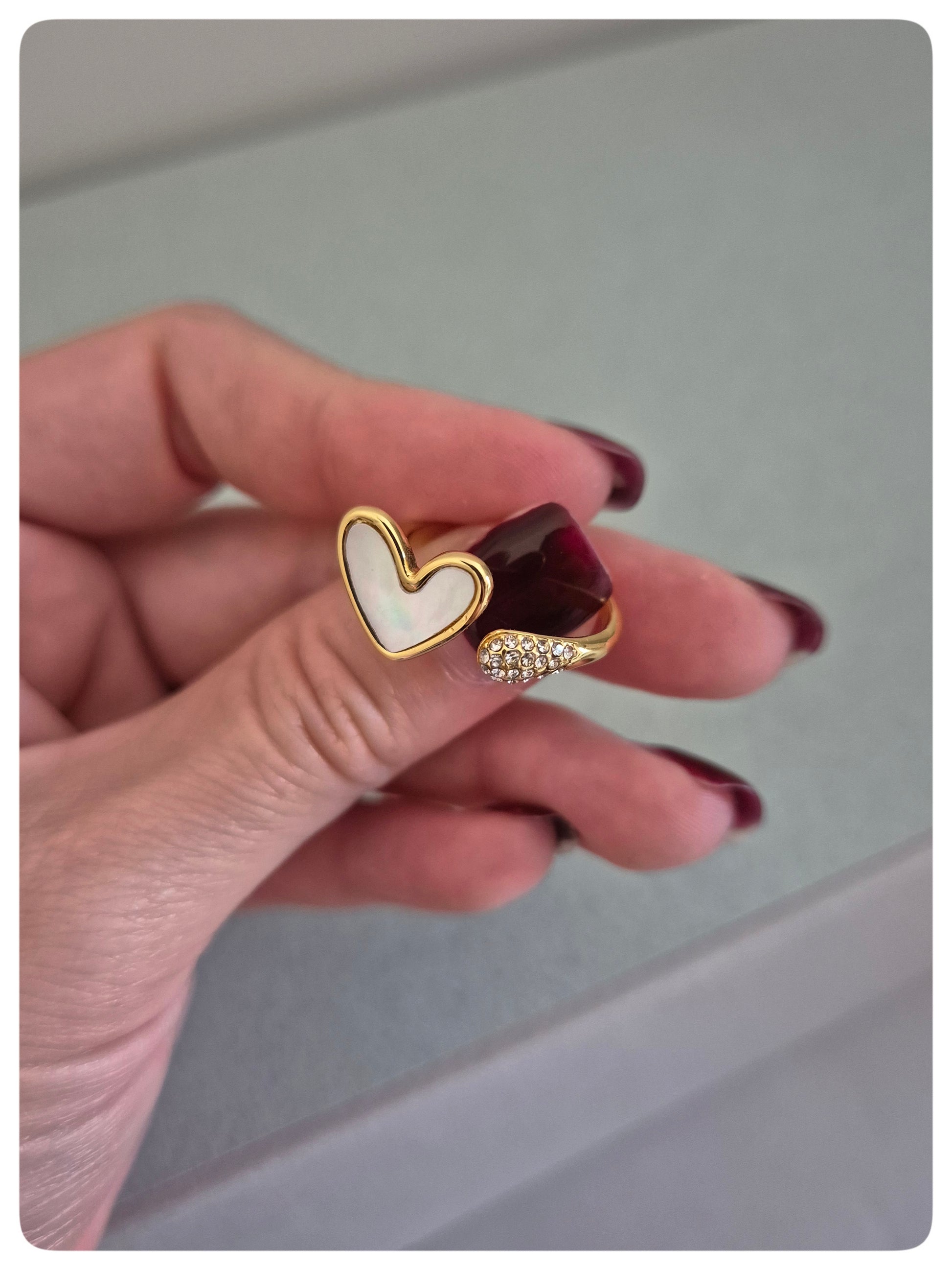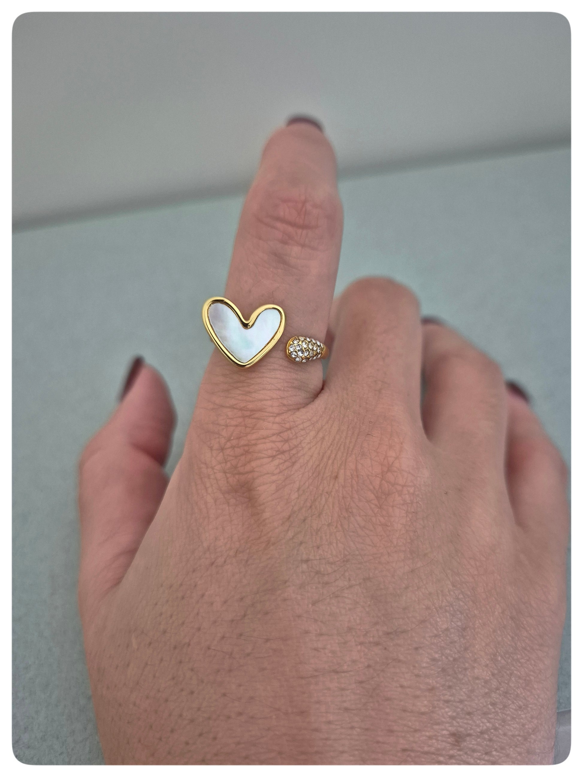 Anillo abierto en tono dorado con detalle de corazón en nácar y toque brillante.