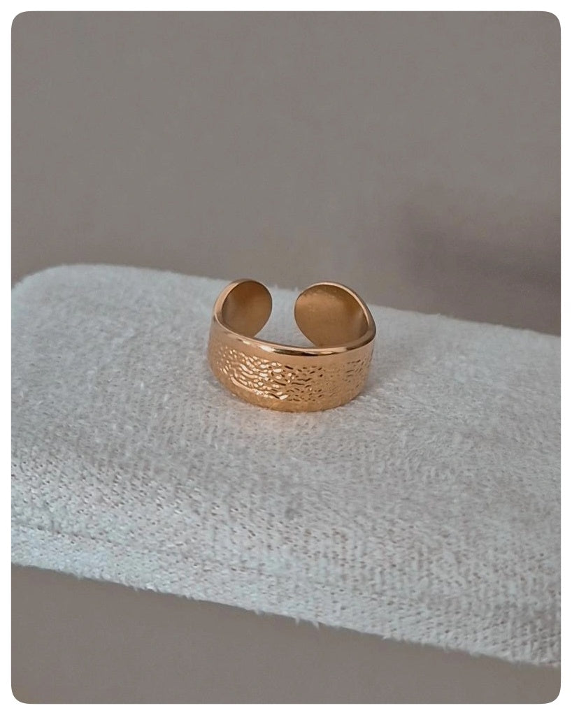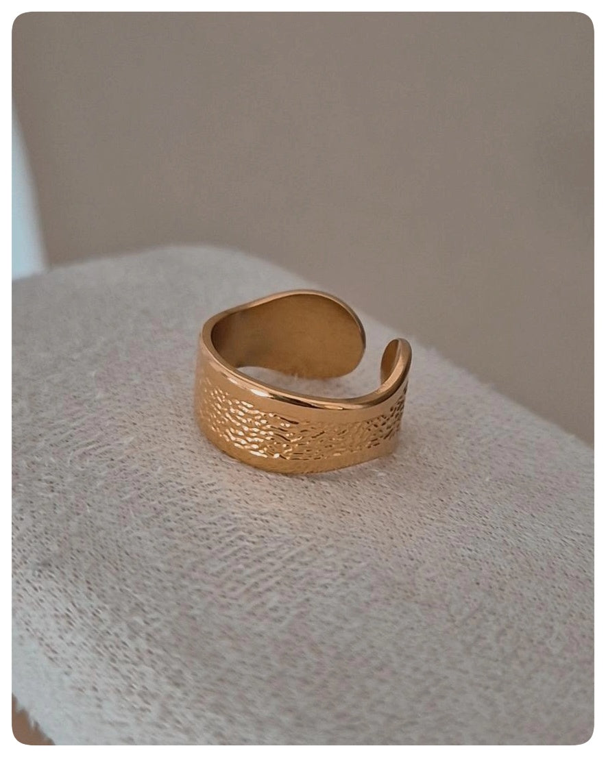 Anillo minimalista de banda ancha en dorado, fabricado en acero inoxidable con baño de oro. Su diseño limpio y elegante lo convierte en una pieza versátil, perfecta para el uso diario. Este anillo es parte de una colección que ofrece variaciones sutiles, lo que te permite combinarlo con otros estilos o llevarlo solo para un toque de sofisticación discreta.