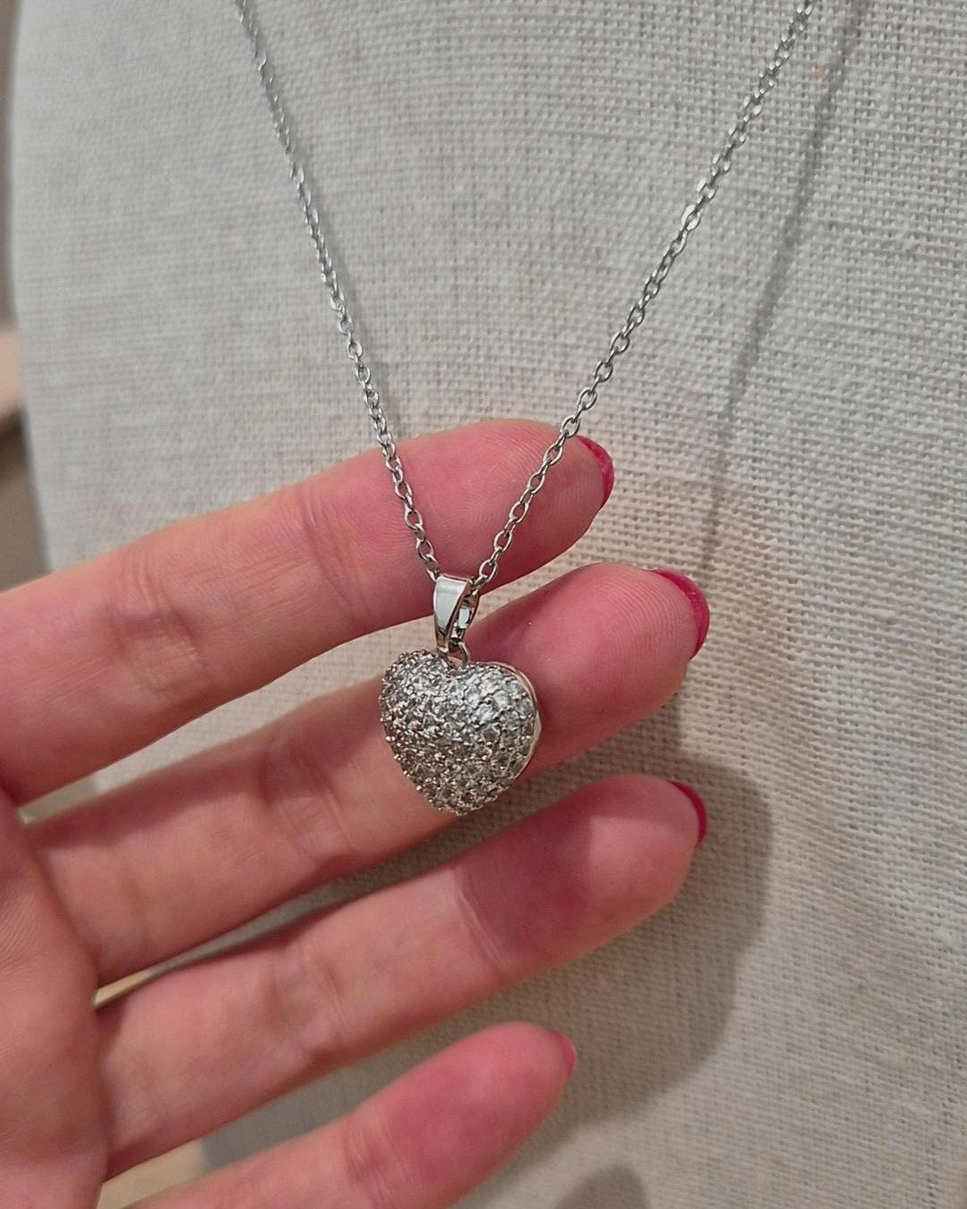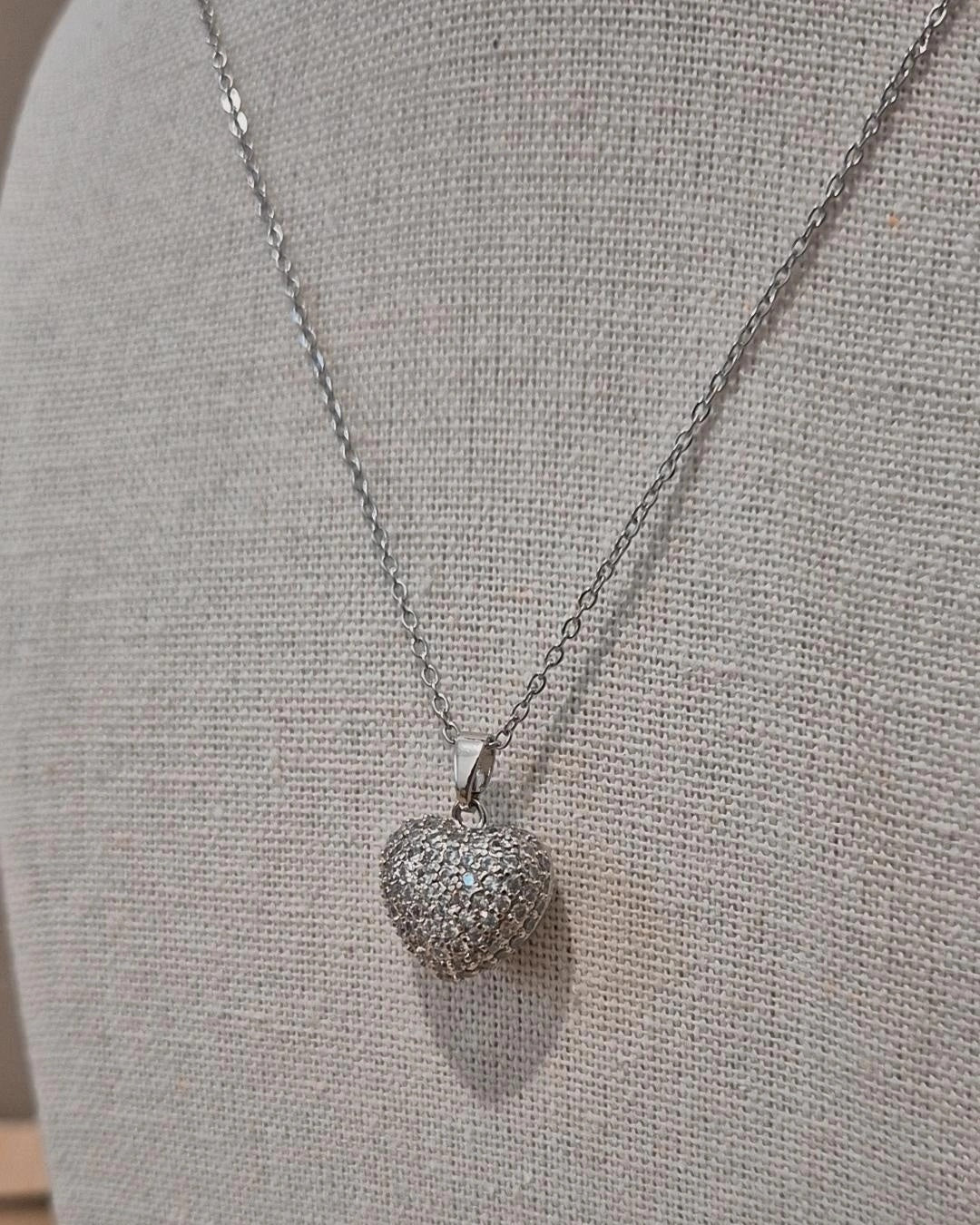 Un elegante collar plateado con un colgante en forma de corazón completamente cubierto de cristales brillantes. Su diseño sofisticado y glamuroso lo convierte en la pieza ideal para destacar en eventos especiales o añadir un toque de elegancia a tu estilo diario.