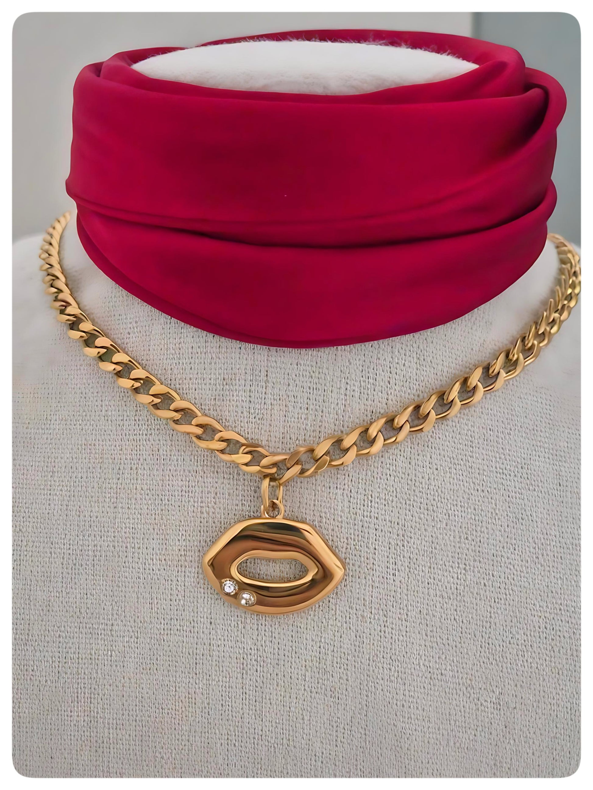 Minimalismo con actitud. El choker beso dorado combina una cadena dorada de acero inoxidable con un dije de labios adornado con circonita, reflejando luz y confianza. Un accesorio que habla por ti, incluso sin palabras.