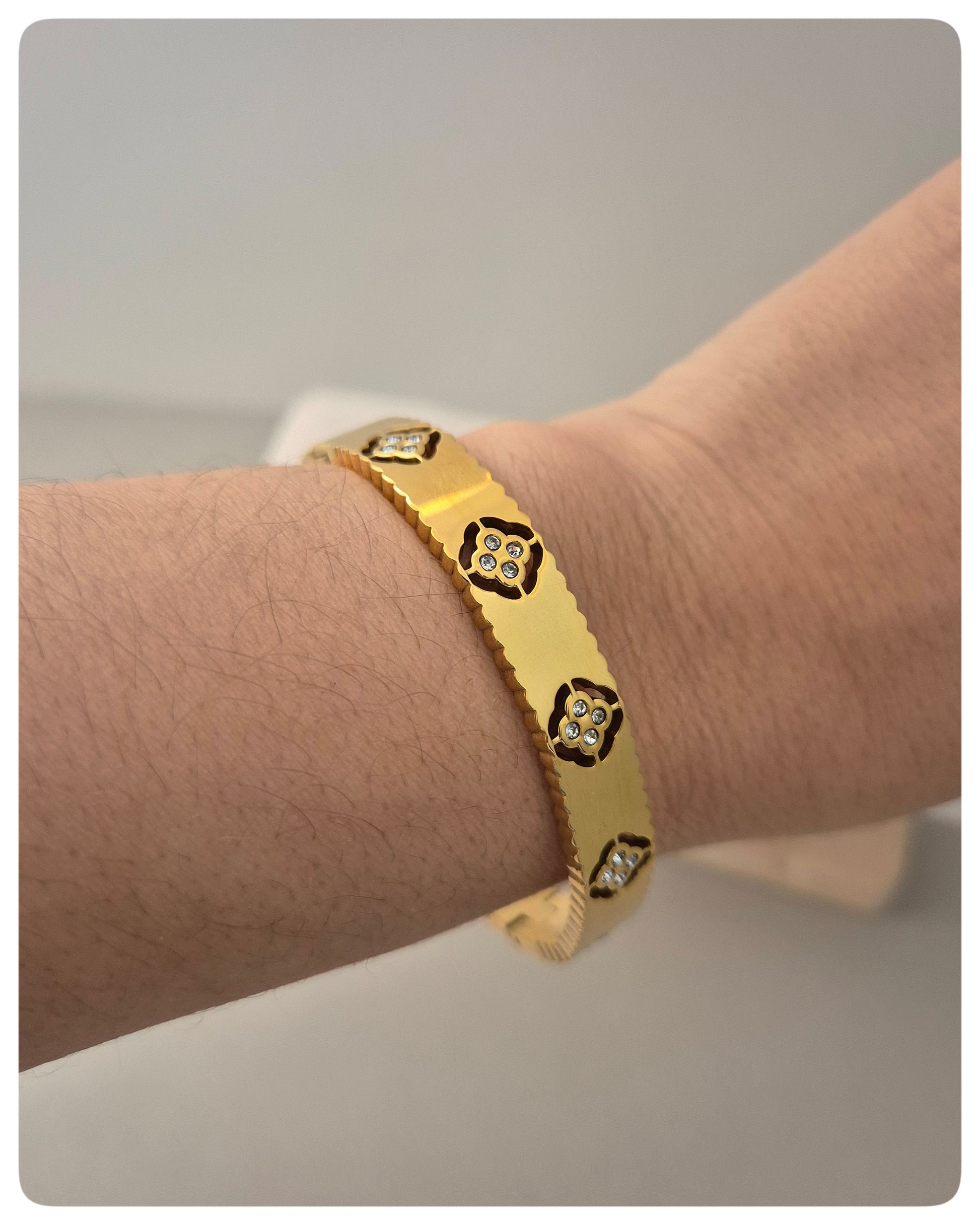 Brazalete dorado en acero inoxidable con detalles de pequeñas flores con circonias incrustadas.