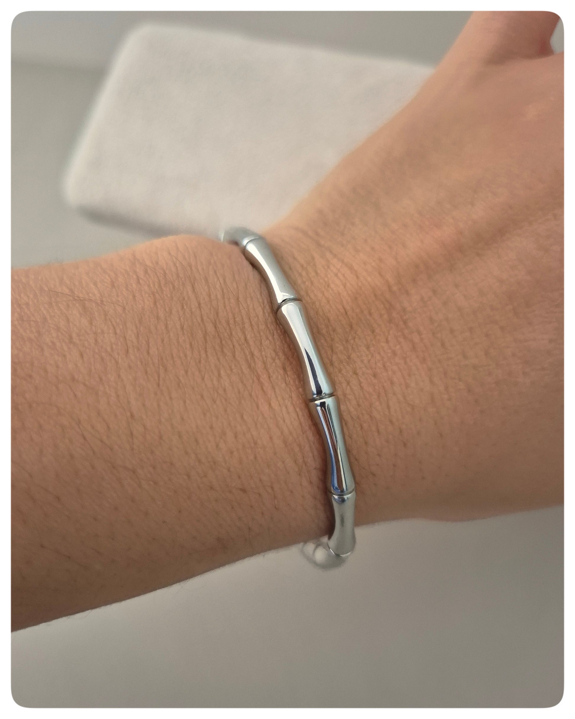 Brazalete rígido en acero inoxidable con diseño tubular segmentado que evoca la forma del bambú.