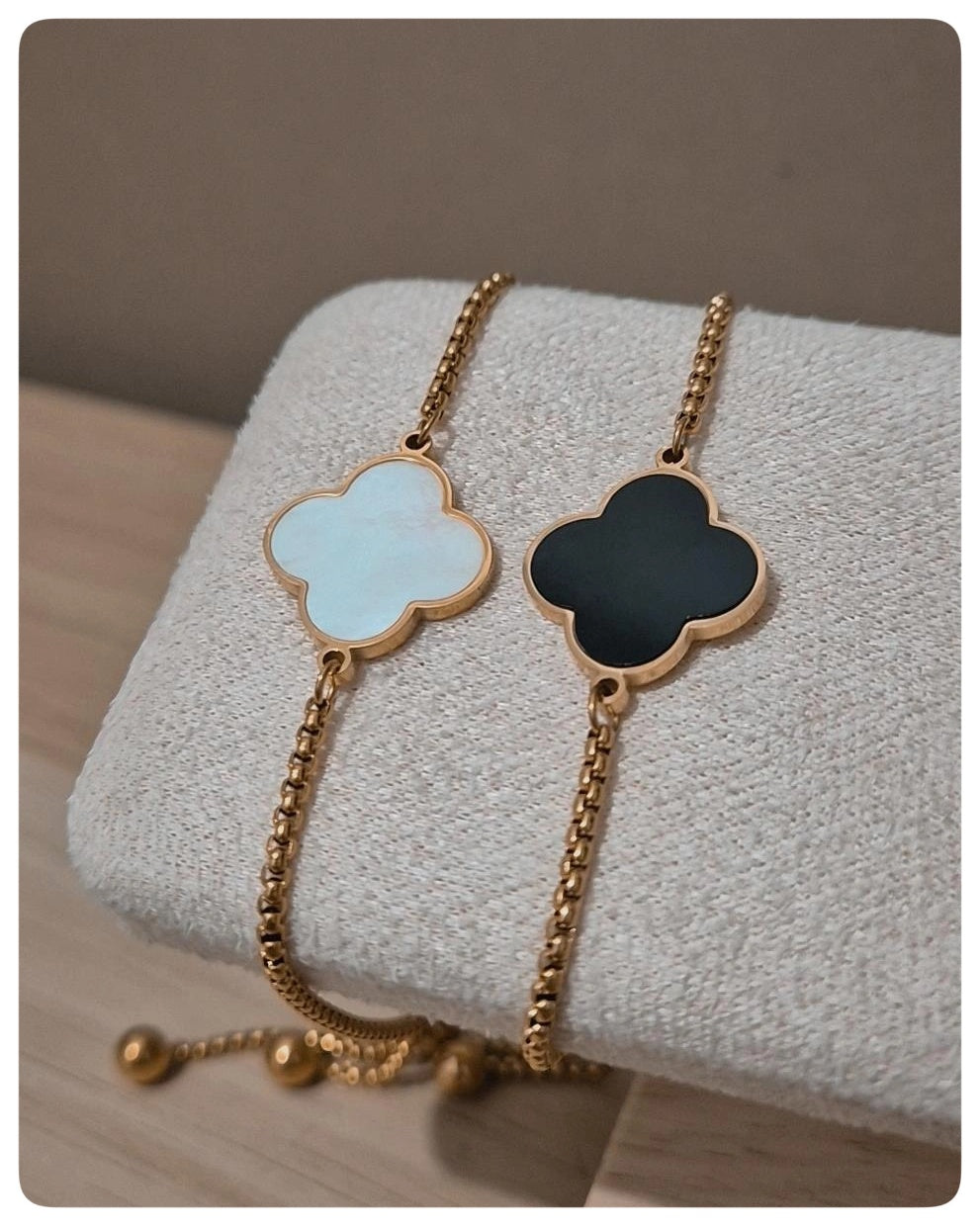Elegantes pulseras ajustables con un dije en forma de trébol de cuatro hojas, símbolo de buena suerte y prosperidad. Cada pieza está enmarcada en un fino acabado dorado, con un contraste sofisticado entre dos colores: blanco y negro. Su diseño delicado y versátil las convierte en el complemento perfecto para cualquier ocasión, aportando un toque de distinción y equilibrio