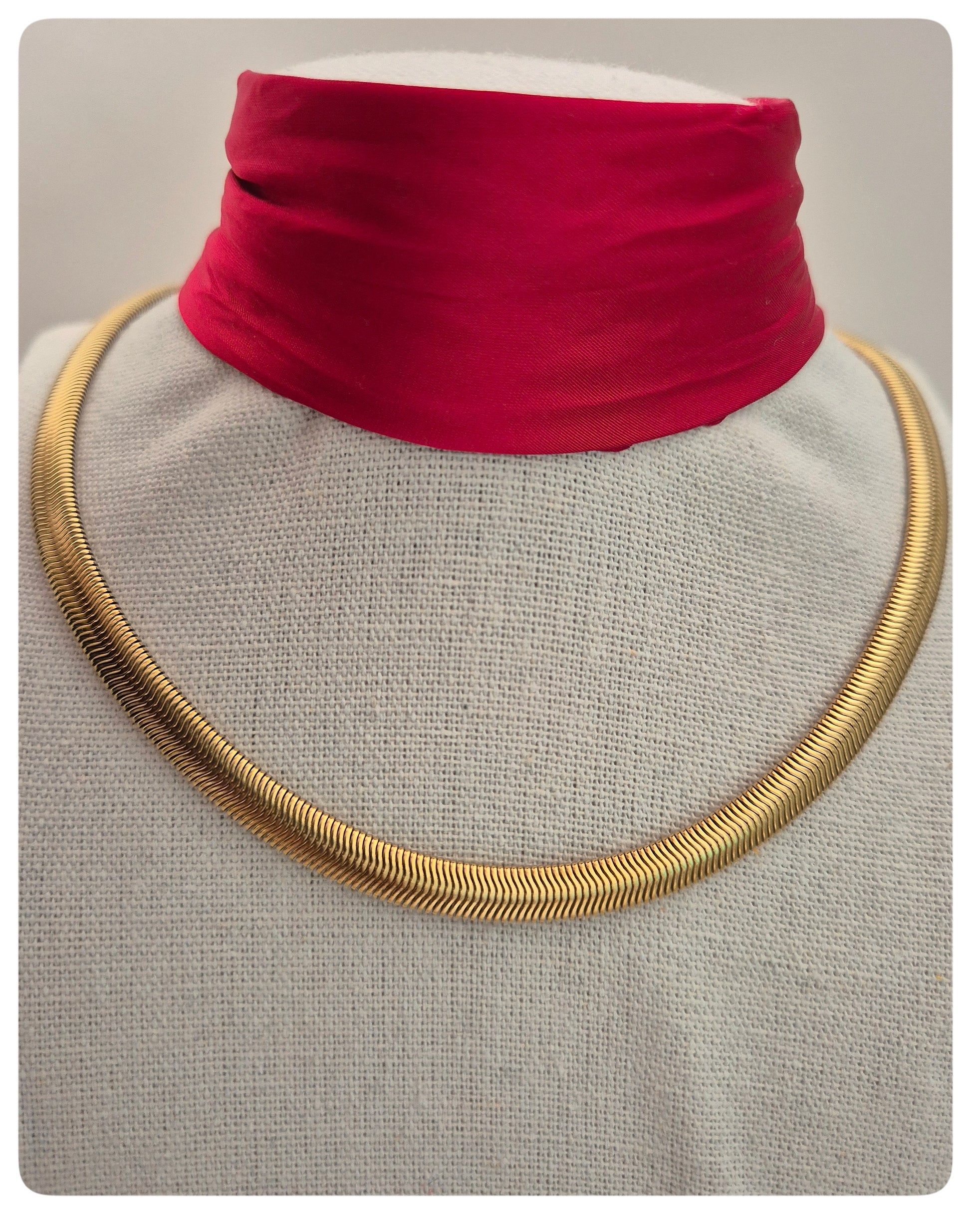 Una joya que deslumbra por su sencillez. La Serpiente Dorada está elaborada en acero inoxidable con baño de oro, con un acabado liso y brillante que se adapta suavemente al contorno del cuello. Perfecta para realzar cualquier look con sofisticación minimalista.