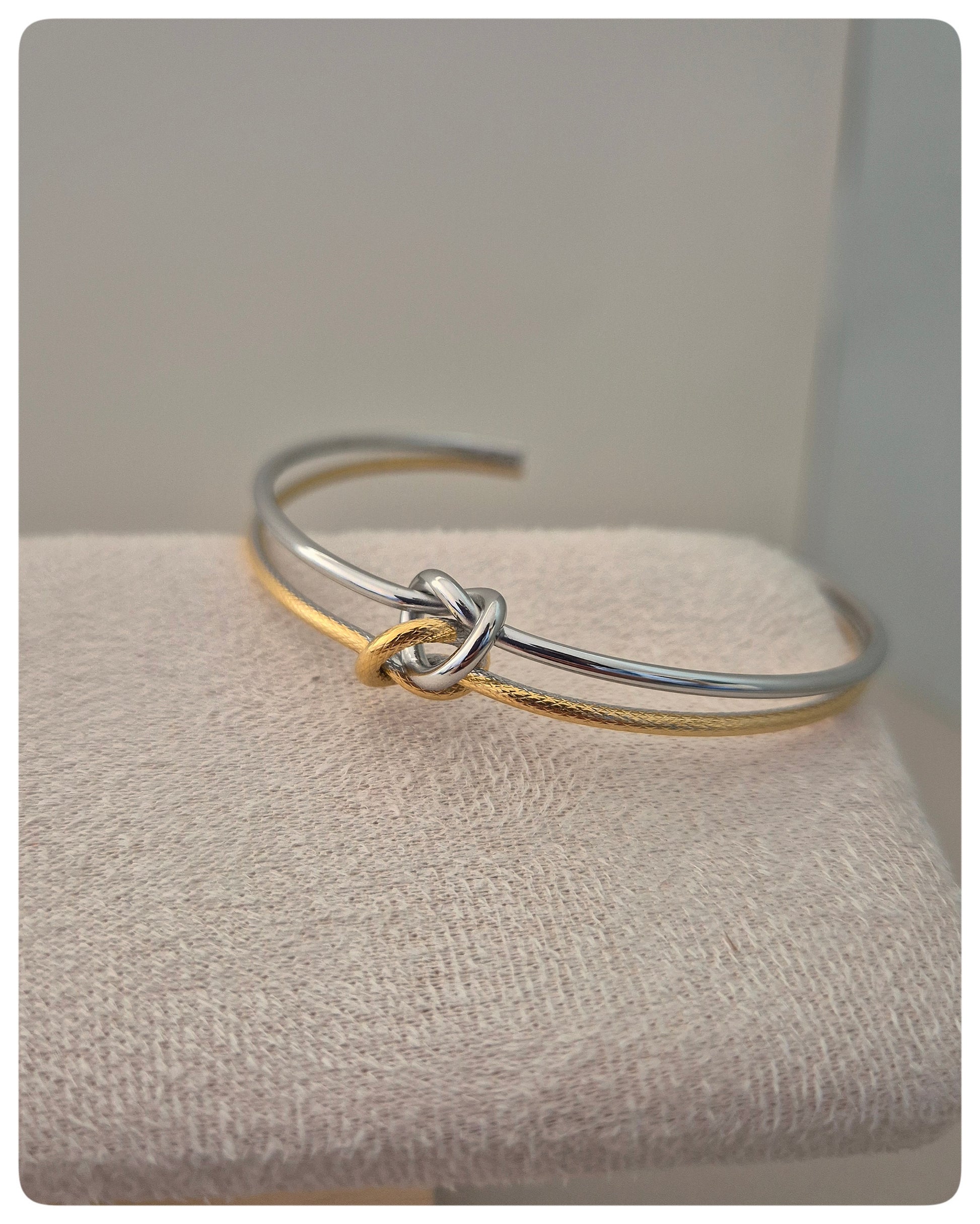 Pulsera rígida bicolor en acero inoxidable con detalle central de nudo.